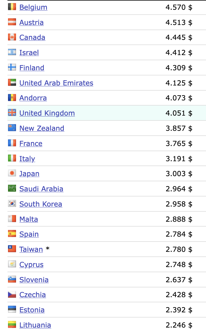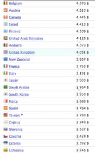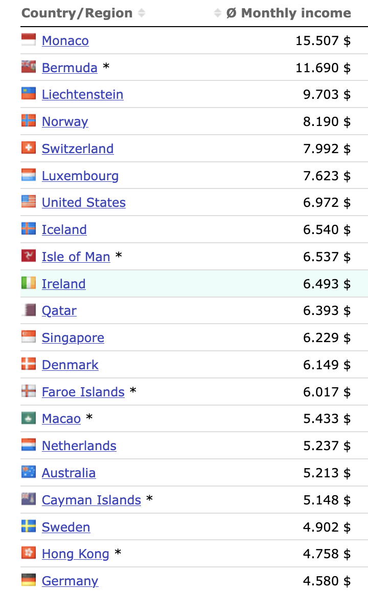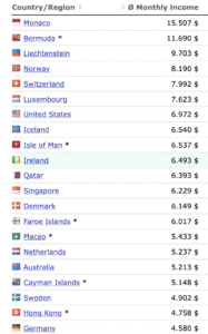 Mònaco lidera el rànquing amb 13.302 euros, mentre que Bermuda és segon amb 10.028 i Liechtenstein 8.323.