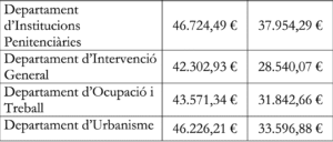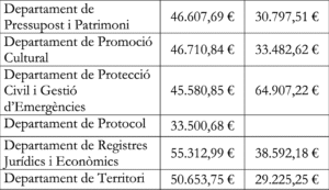 La policia és el departament amb els sous més alts de mitjans. En el grau mitjà (B) està en 57.747 euros i en el baix (C) en 40.828. Els pitjor pagats són els funcionaris de Protocol amb 33.500 euros anuals en general. Després els empleats del departament de formació professional al llarg de la vida amb un sou anual d’entre 35.000 i 36.000 euros.