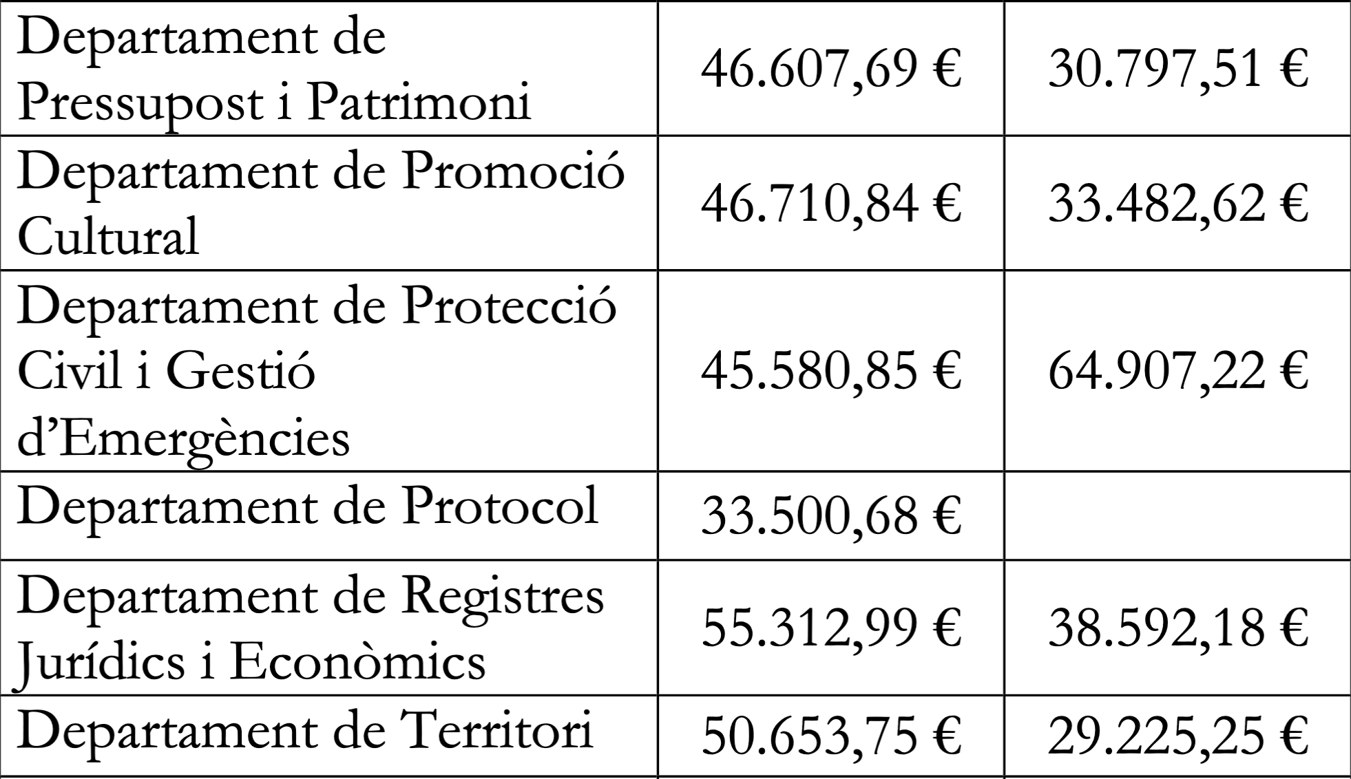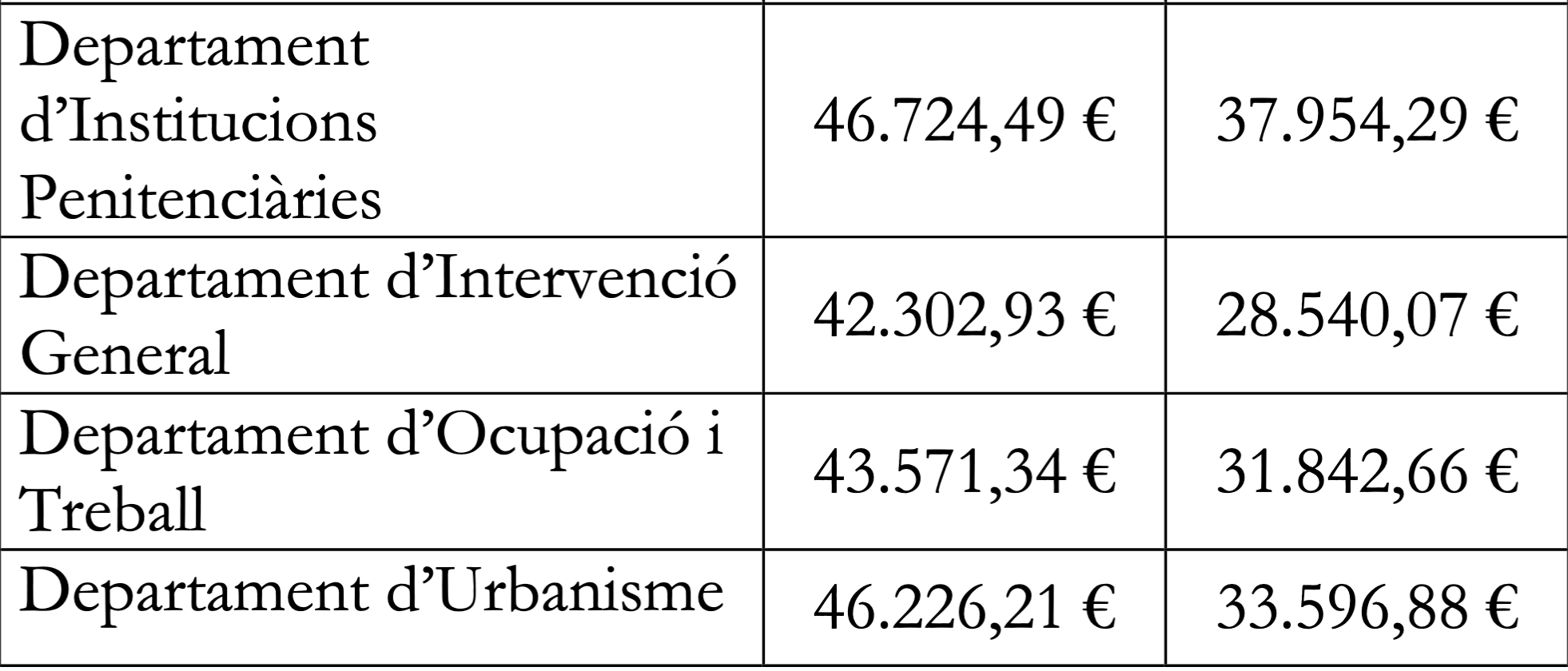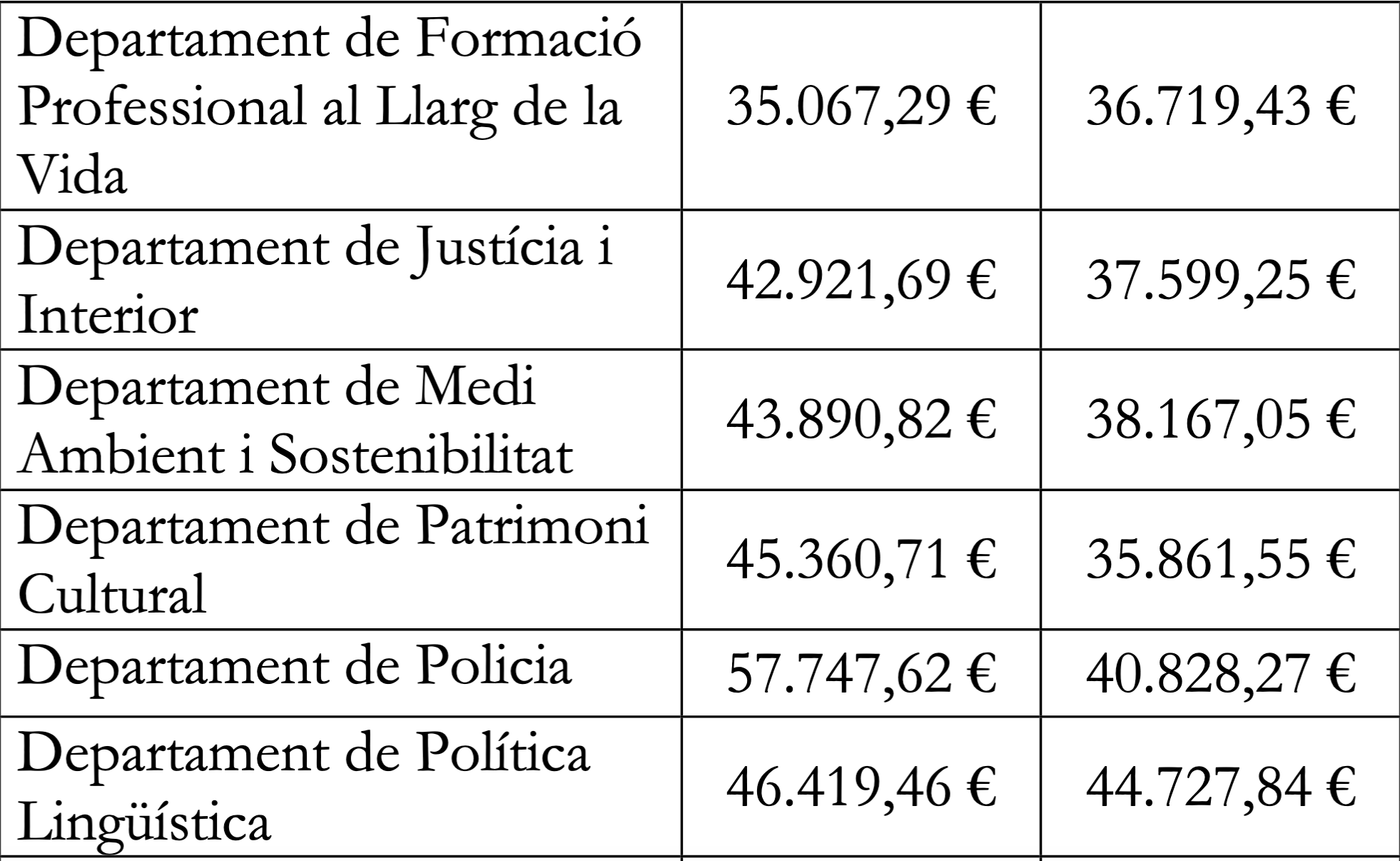 La policia és el departament amb els sous més alts de mitjans. En el grau mitjà (B) està en 57.747 euros i en el baix (C) en 40.828. Els pitjor pagats són els funcionaris de Protocol amb 33.500 euros anuals en general. Després els empleats del departament de formació professional al llarg de la vida amb un sou anual d’entre 35.000 i 36.000 euros.