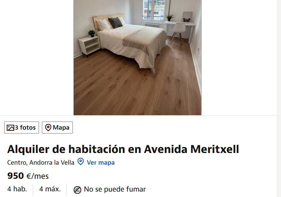 Els preus del lloguer continuen a l’alça a Andorra la Vella, on les últimes ofertes reflecteixen un increment notable del cost de l’habitatge. Un exemple publicat al portal Idealista mostra una habitació al centre de la capital per 950 euros mensuals, una xifra que evidencia la dificultat creixent per accedir a allotjaments assequibles.