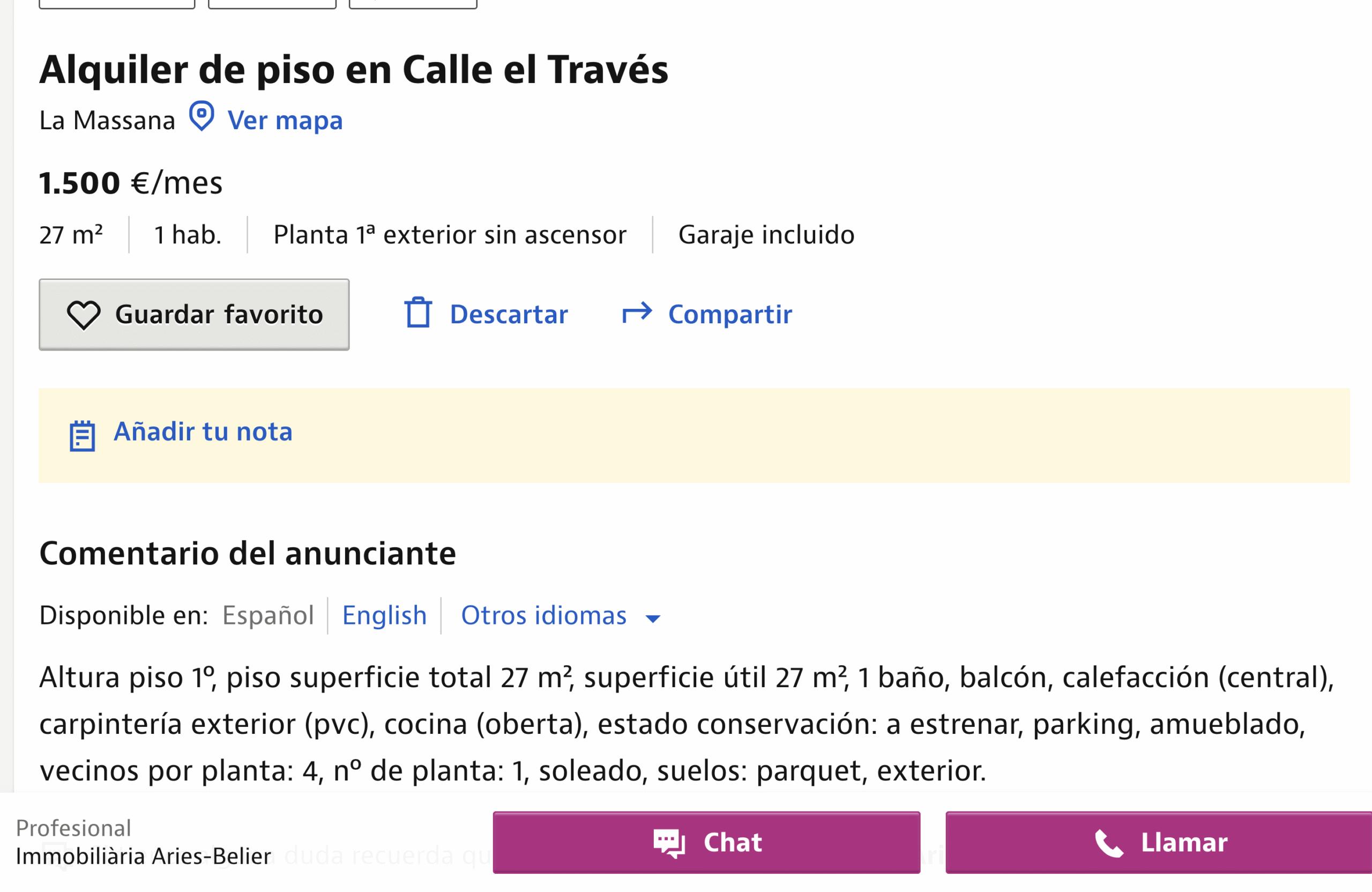 El desmesurat preu al qual estan arribant els pisos de lloguer a Andorra té una mostra perfecta en un dels anuncis que recull el portal Idealista. Es tracta d’un habitatge minúscul de 27 metres quadrats situat al carrer El Través de la Massana. El cost és de 1.500 euros al mes. La mitjana que s’estaria pagant per metre quadrat de lloguer cada mes és de 55,56 euros.
