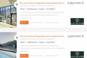 El sector immobiliari andorrà manté la seva tendència alcista en el segment de luxe. A Escaldes-Engordany, hi ha dos àtics de nova construcció que superen els 15.000 euros per metre quadrat i arriben fins als 16.667 euros. Un habitatge de 330 metres quadrats s’ofereix per 5,5 milions d’euros, mentre que un altre de 452 metres s’enfila fins als 6,95 milions. Tots dos immobles es troben a la zona d’Els Vilars, una de les més cobejades del país, i confirmen la consolidació d’Andorra com a mercat premium, impulsat per la demanda internacional i la limitació del sòl disponible.