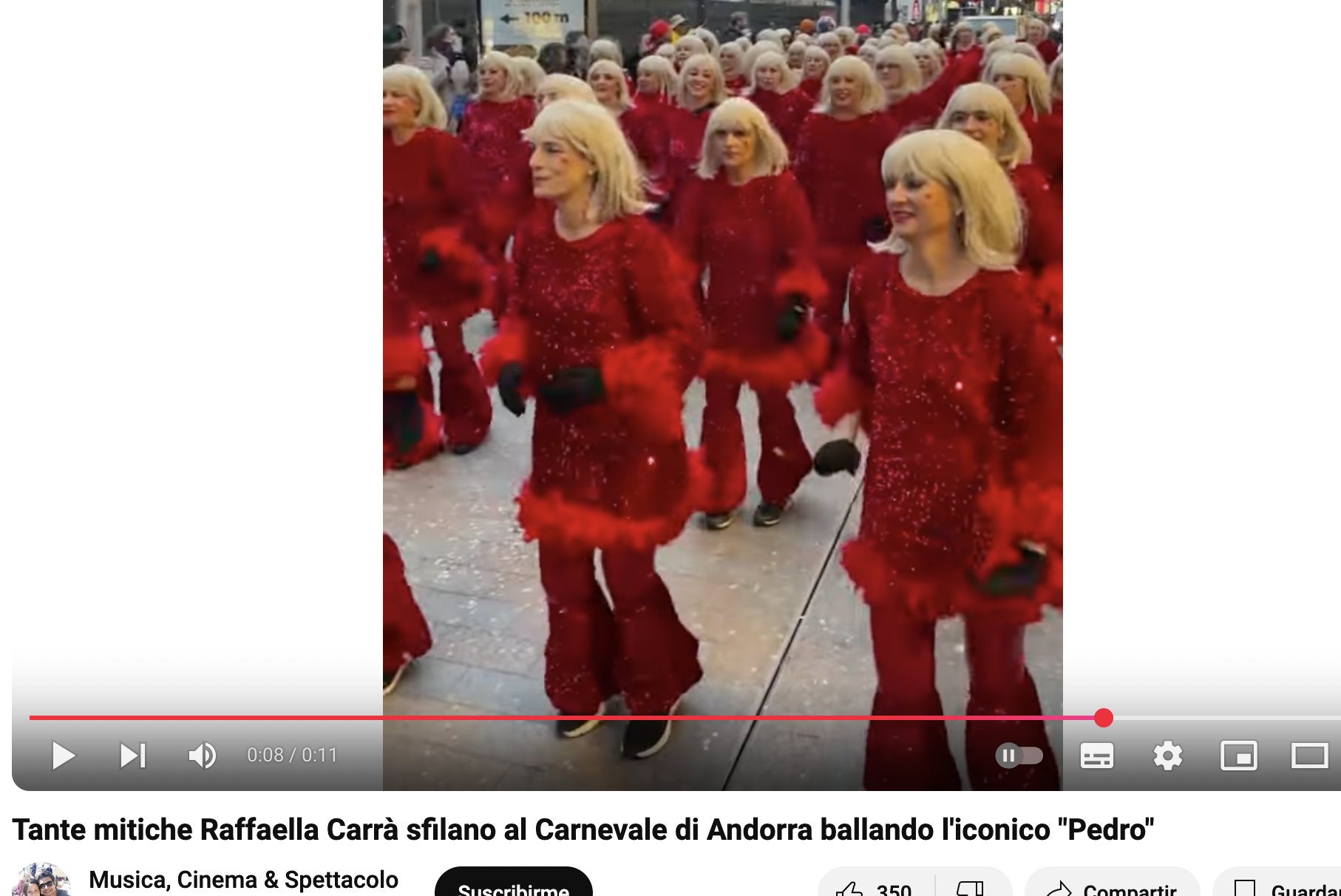 El vídeo d’una cinquantena de dones d’Andorra disfressades de Raffaella Carrà i cantant i ballant les seves cançons s’ha viralitzat fora del Principat. Les imatges de la comparsa, que participava en la rua conjunta d’Andorra la Vella i Escaldes, ha travessat fronteres. Seguidors i seguidores de la mítica cantant italiana l’han reenviat com a homenatge a l’artista.