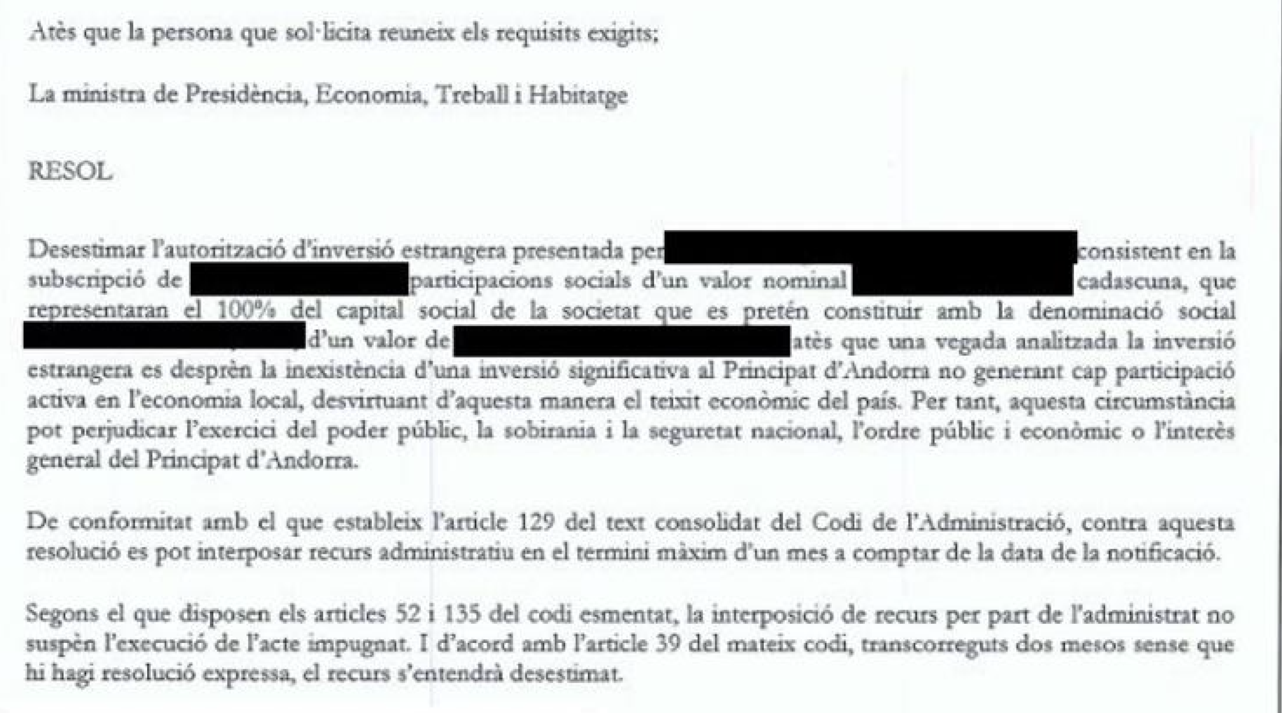 Un exemple clar és el document que s’ha fet públic a les xarxes socials on es mostra com s’ha tombat una petició d’inversió forana per no complir els nous requisits. Concretament, en aquest cas ers rebutja la petició perquè “una vegada analitzada la inversió estrangera es desprèn la inexistència d’una inversió significativa al Principat d’Andorra no generant cap participació activa en l’economia local, desvirtuant d’aquesta manera el teixit econòmic del país”.