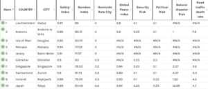 L’índex recull múltiples avaluacions com l’índex d’assassinats, segrestos, mort en accident de trànsit, desastres naturals, robatoris o incidència de possibles conflictes armats. La primera ciutat espanyola de la classificació és Madrid en el lloc 41 i la francesa Niça en el 64.
