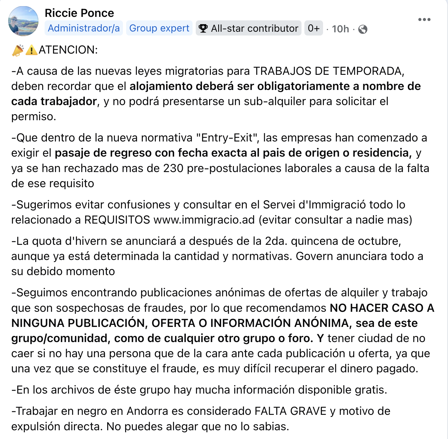 Argentinos en Andorra ha fet un avís a través de les xarxes socials on comunica als immigrants del seu país que vinguin a fer de temporers que hi ha una nova sèrie de requisits per treballar al Principat d’Andorra. El més important és que en la petició han d’incloure un allotjament al seu nom per cada treballador i no és vàlid el subarrendament. També les empreses no poden presentar a Immigració la seva tramitació per al permís sense que tinguin un bitllet d’avió de tornada amb una data exacte quan finalitzi el contracte de la temporada, abril o maig, perquè no es puguin quedar al Principat o a un dels països europeus.