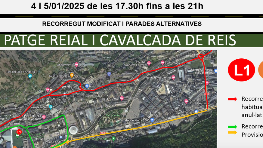 La celebració de la Cavalcada dels Reis Mags d’Orient els dies 4 i 5 de gener comportarà modificacions i afectacions en els trajectes i horaris de totes les línies regulars de transport públic a Andorra. Mou-te en Bus ha informat en un comunicat que les alteracions es duran a terme principalment entre les 17.30 h i les 21.00 h, aproximadament, afectant tant les línies urbanes com interurbanes.