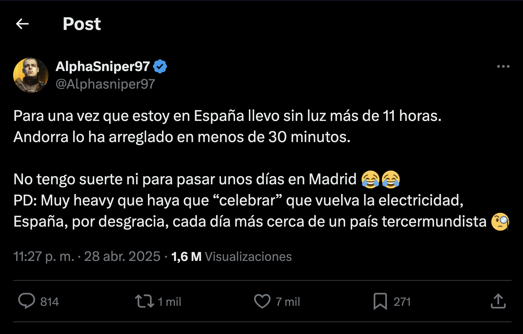 PD: Muy heavy que haya que “celebrar” que vuelva la electricidad, España, por desgracia, cada día más cerca de…— AlphaSniper97 (@Alphasniper97) April 28, 2025