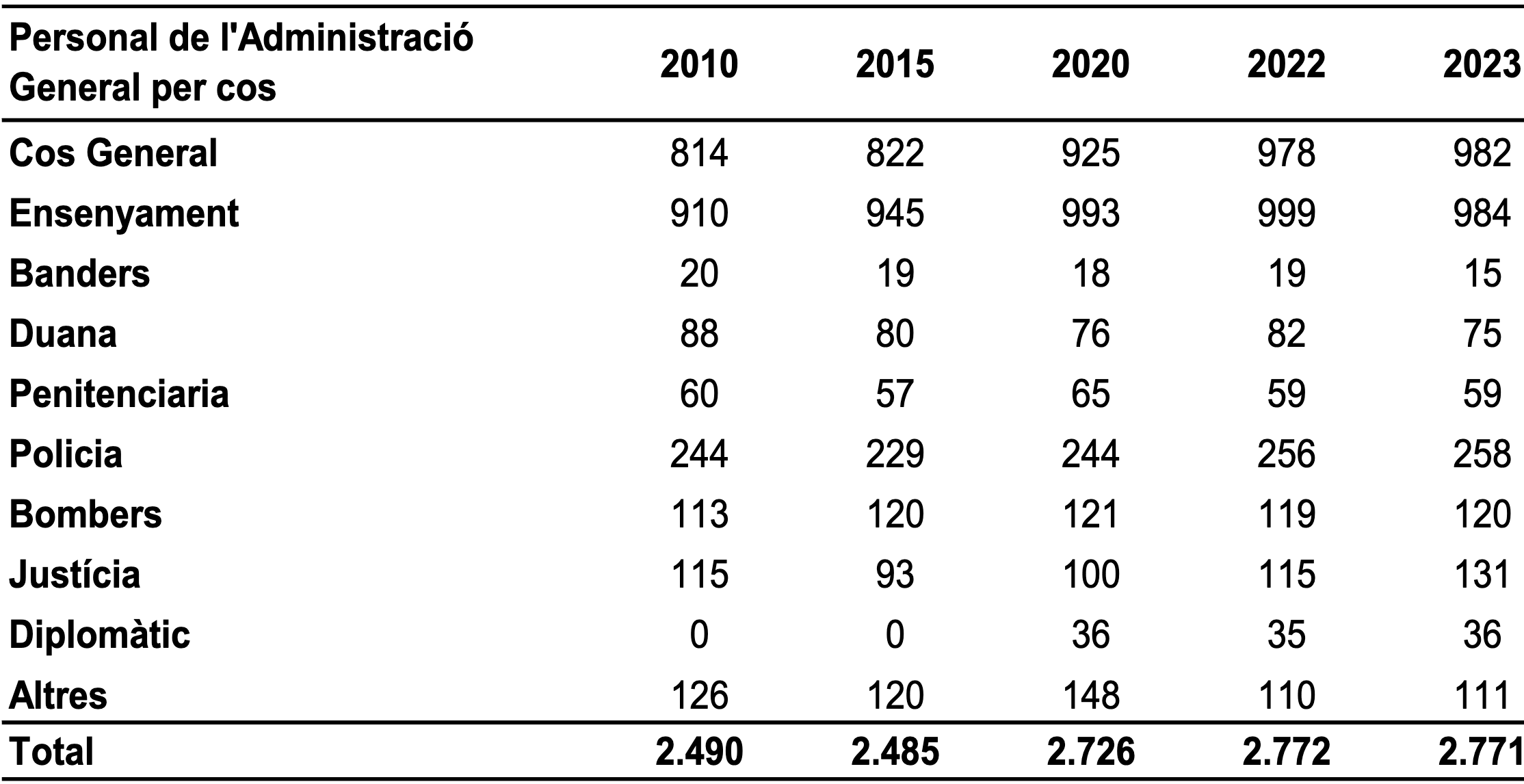 El personal de l’Administració General se situa 2.771 persones. Ensenyament és el cos amb més personal (984) amb un 35,5% gairebé empatat amb els treballadors de Govern (982) amb un 35,4%. En la divisió per sexe, 1.630 són dones (el 58,8%) i 1.141 homes (el 41,2%). La distribució, però és desigual entre els diferents cossos que integren l’Administració General. Banders està format només per homes. Els cossos amb una àmplia majoria d’homes són Bombers (97,5%), Policia (89,9%), Presó (86,4%) i Duana (80%).