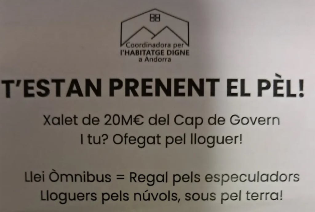 Durant les darreres hores està circulant per les xarxes un cartell de la Coordinadora per l’Habitatge Digne a Andorra. Tal com ha compartit un usuari, es tracta d’una campanya que critica directament el suposat cost del xalet que s’està construint el cap de Govern Xavier Espot, que asseguren és de 20 milions d’euros.