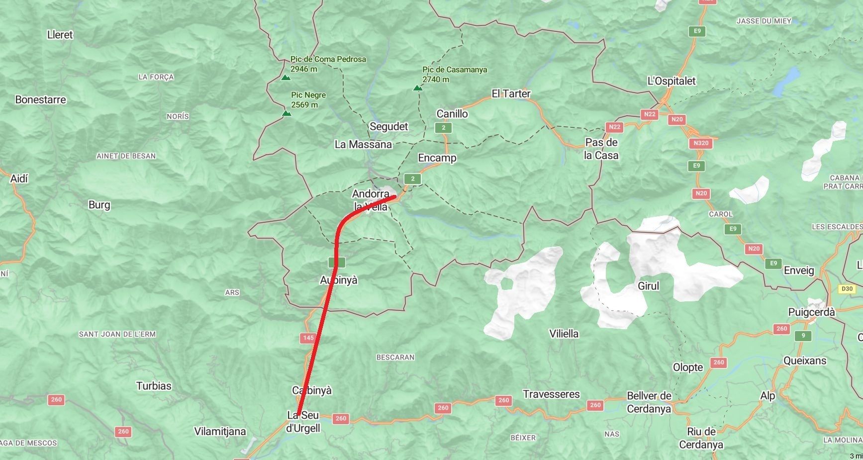 El recorregut que faria el tramvia entre la Seu i Andorra.
