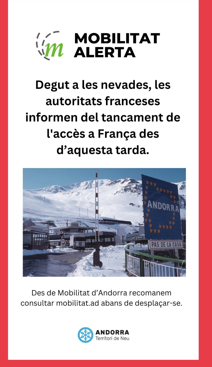 El tall a la carretera RN20 de connexió entre França i Andorra s’allarga fins demà. Inicialment havia de ser puntual per retirar els vehicles atrapats a la ruta per falta d’equipaments. Posteriorment, les condicions de la calçada plena de neu i gel i l’escassa visibilitat han portat a allargar el tall fins demà. No hi ha hora fixada per a la reobertura i dependrà de l’evolució de la climatologia.