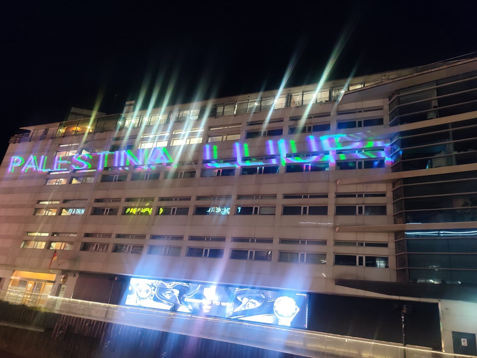 Acció Anarquista Andorrana, una nova plataforma ciutadana que neix en defensa dels drets del poble de Palestina, ha reivindicat una primera acció que van dur a terme ahir, al mateix temps que se celebrava la manifestació a la plaça de la Rotonda. Sota el lema ‘Llums per Palestina’, van projectar en edificis a tocar de la plaça un seguit de missatges on es podia llegir ‘Palestina lliure’, ‘Free Palestine’, ‘Andorra Estat còmplice’, ‘Israel Estat genocida’, ‘Boicot Coca-cola’ o ‘Boicot Carrefour’, entre altres.