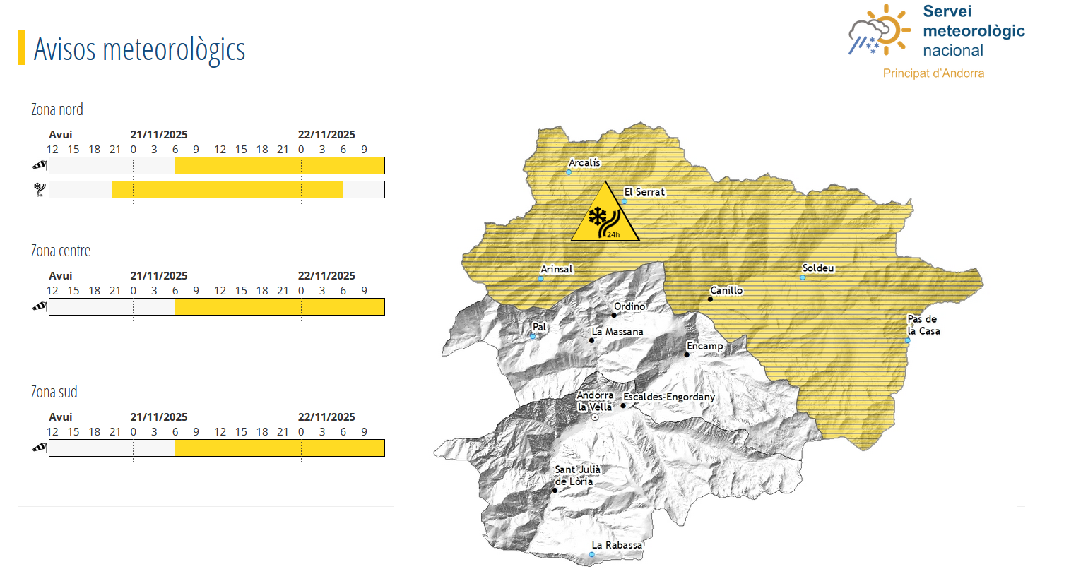 De cara a demà divendres, el canvi de direcció del vent cap al nord-oest reforçarà notablement la nevada durant la tarda. El fenomen afectarà principalment les parròquies del nord del país, on les precipitacions de neu guanyaran intensitat a mesura que avanci la jornada. Davant d’aquest escenari, s’ha activat l’avís groc per risc de nevades.