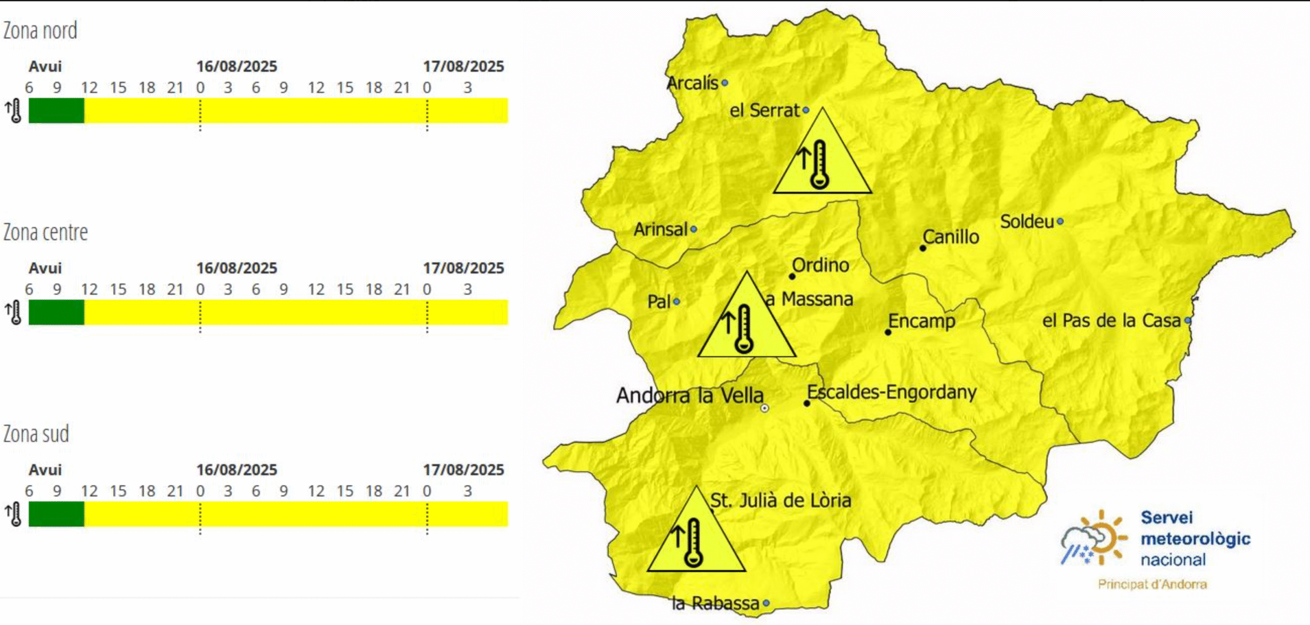 Les altes temperatures tornen a activar l’#avís_groc per calor🌡️ a #Andorra arreu del país. No hem d’oblidar l’excepcionalitat de registrar màximes de 20ºC a 2.500 metres🏔️, 30ºC a 1.500 metres i fins a 34ºC a 1.000 metres, així com no baixar de 15ºC de nit. pic.twitter.com/BBGEHC4gzp