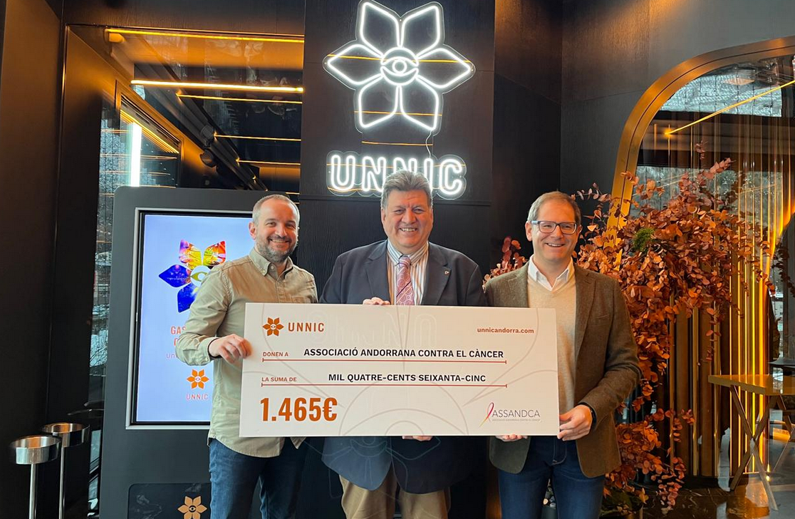Unnic Andorra continua ferm amb el seu compromís amb la Responsabilitat Social Corporativa (RSC). Aquest dimarts, en el marc d’una nova acció solidària, ha lliurat un xec per import de 1.465 euros a l’Associació Andorrana Contra el Càncer (ASSANDCA). La quantitat prové íntegrament de la recaptació registrada en el concert tribut a Hombres G, celebrat el passat 28 de novembre, i en el que de cada entrada venuda es va destinar un percentatge a aquesta causa.