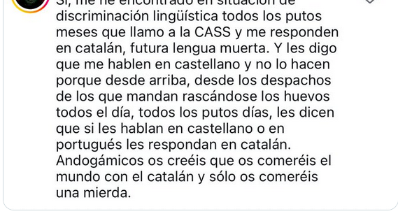 “Todos los putos meses llamo a la CASS y me responden en catalán, futura lengua muerta. Y les digo que me hablen en castellano y no lo hacen porque desde arriba, desde los despachos de los que mandan rascándose los huevos, les dicen que si hablan en castellano o portugués les respondan en catalán”, ha escrit l’autor del missatge, que ha qualificat l’ús de la llengua oficial del país com una imposició.